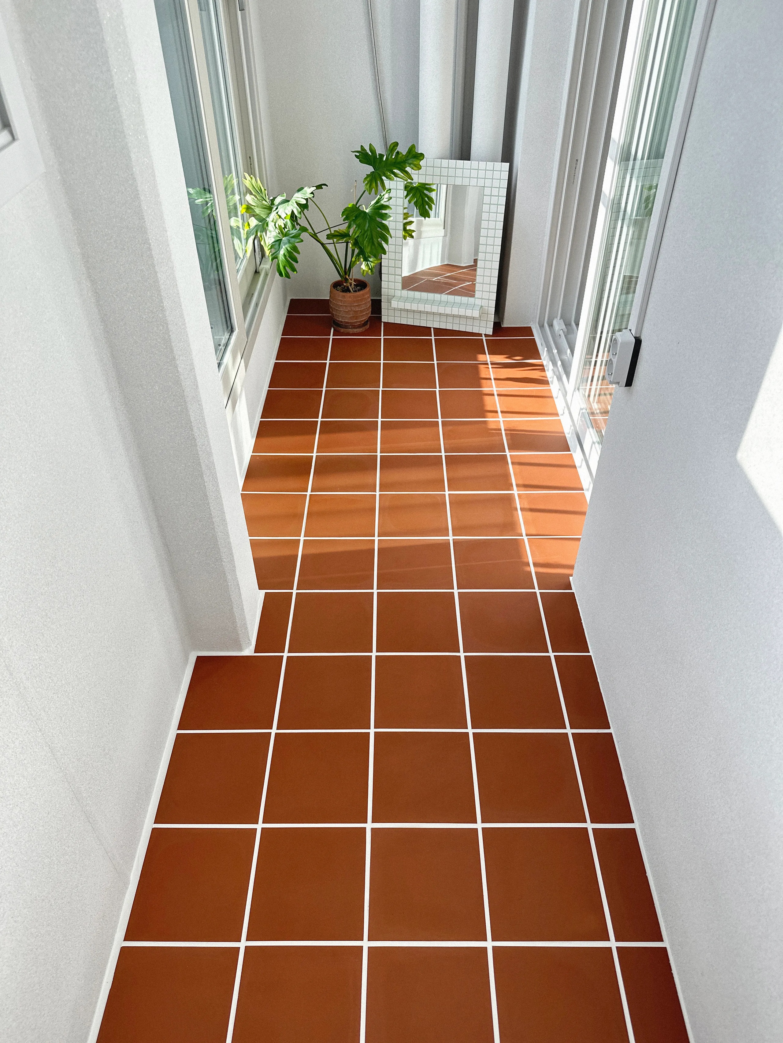 안쪽에 보이는 구멍이 우수관 배수구입니다.배수구를 기준으로 경사를 잡고 타일 시공을 실시합니다.300mmx300mm 각타일입니다.가로 4650x세로 1500정도 베란다입니다.